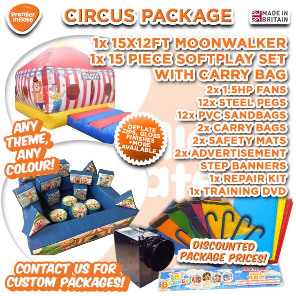 Circus Themed Bouncer Package for Sale which includes a Circus themed Moonwalk Bouncer together with a 15 Piece Soft Play Set and Foam Ball Pond which have also been finished with impressive circus themed digitally printed artwork.