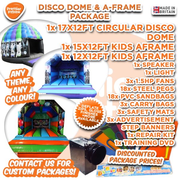 Disco Bouncy Castle Package for Sale which includes a Circular Disco Dome, 15x12 Disco Bouncy Castle and a 12x12 Disco Bouncer - An extremely popular theme given that it appeals to a wide age range and both boys and girls. Although this package can still be adapted to any theme you require at no additional cost.