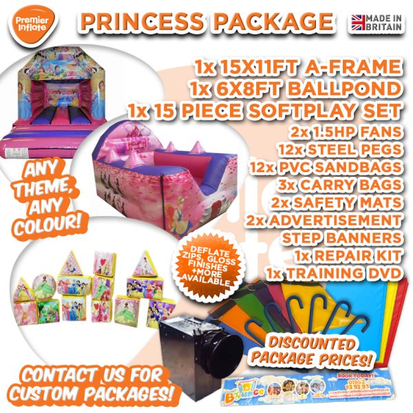 Princess Bouncer Package for Sale which includes our most popular sized Bouncy Castle 15x11ft, 6x8ft Inflatable Ball Pond and a 15 Piece Soft Play set which has been finished off with Princess themed digitally printed vibrant artwork.