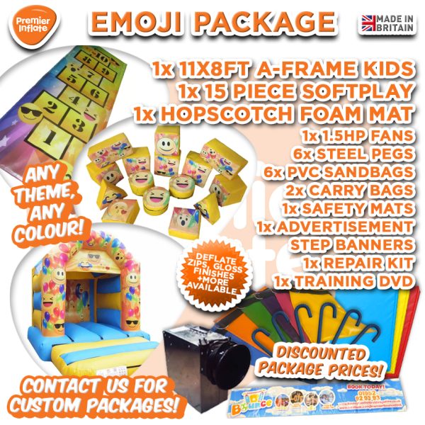 Toddler Emoji Bouncer Package - A great Package for Toddler Hires as it includes an 11x8ft A Frame Toddler Bouncy Castle, 15 Piece Soft Play Set with Foam Ball Pond and a soft play Hopscotch all completed with fun Emoji Artwork. However all our packages can be personalised with the colours and artwork of your choice.